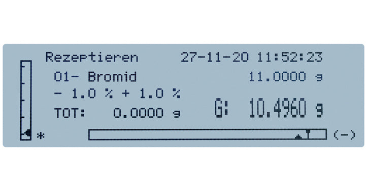 - Rezeptdatenbank mit Benutzerführung – bis zu 99 Rezepturen mit je 20 Bestandteilen können direkt in der Waage gespeichert werden. Name und Sollwert jedes Bestandteils sind hinterlegbar und bequem über das Display abrufbar